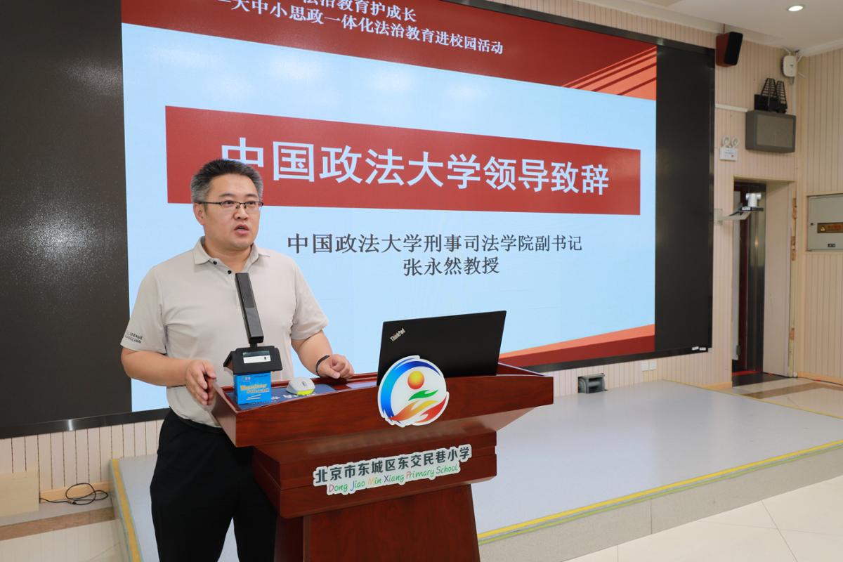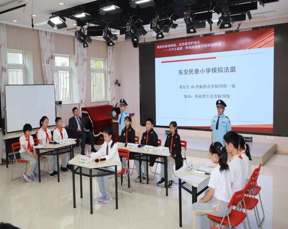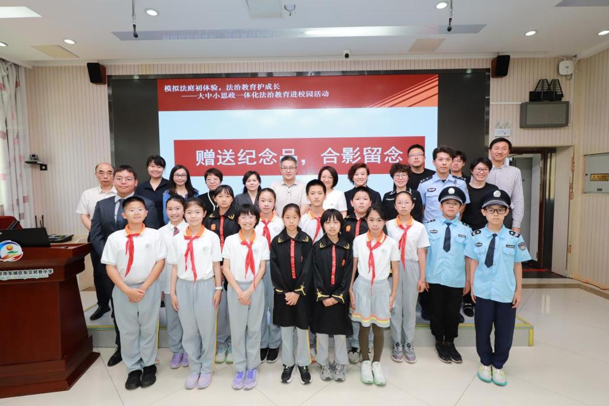 5月20日,刑事司法学院“明法之光”宣讲团在东交民巷小学举办模拟法庭暨“法治教育进校园”成果展示活动。东交民巷小学党委书记傅晓静、刑事司法学院党委副书记张永然、2022、2024级研究生辅导员赵松云出席活动。