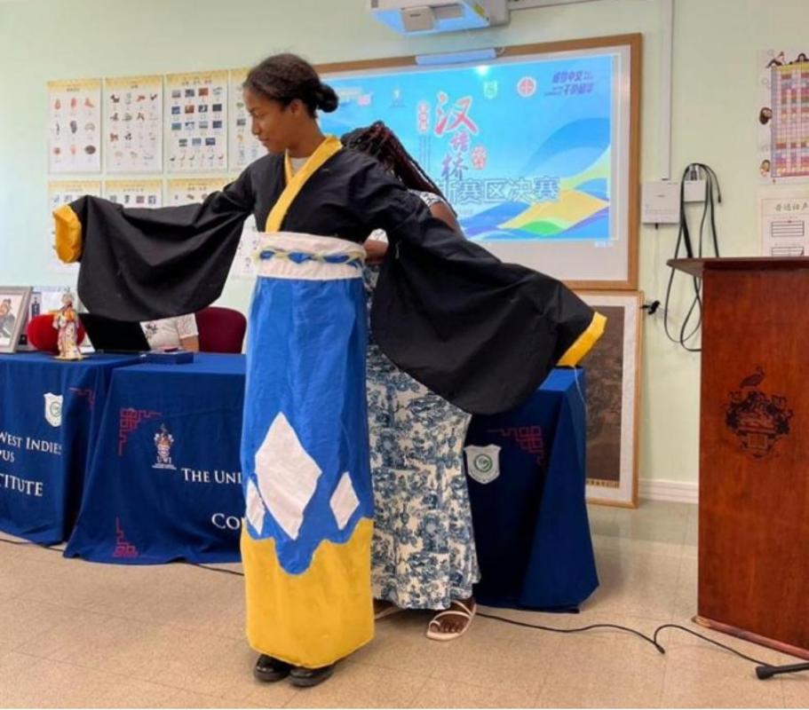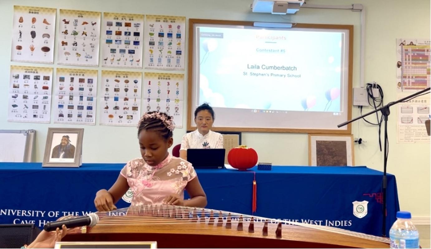 比赛内容涵盖中文自我介绍、中文主题演讲、文化问答及才艺展示等多个环节。值得一提的是,才艺展示环节形式多样、亮点纷呈。一位中学生展示了红烧肉的制作并现场分享了这一中国美食,另一位中学生缝制了带有中国特色的传统服饰,当场穿着展示起来。小学组选手莱拉(Laila)用古筝演奏了《春江花月夜》,赢得满堂喝彩,这是巴巴多斯首次出现演奏中国古筝的本地小学生。这些形式多样的才艺表演丰富了比赛内容,彰显了中国文化内涵。选手们在舞台上展现出的语言能力、自信风采与文化素养,不仅反映出他们学习汉语的热情和成果,也体现出孔院教师的良好教学效果。
