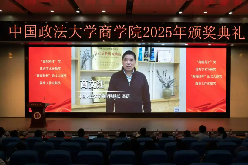 《商院大事记》为典礼拉开序幕。院长商文江在视频中深情寄语,向所有获奖师生表示祝贺。回顾过去一年国际法商融合项目从宏阔理念落地到场景化实践的积极探索和阶段性突破,他勉励大家立志做大事,从身边小事做起,做到思维宏阔、行动落地,期待全体师生携手在法商融合的道路上坚定前行。