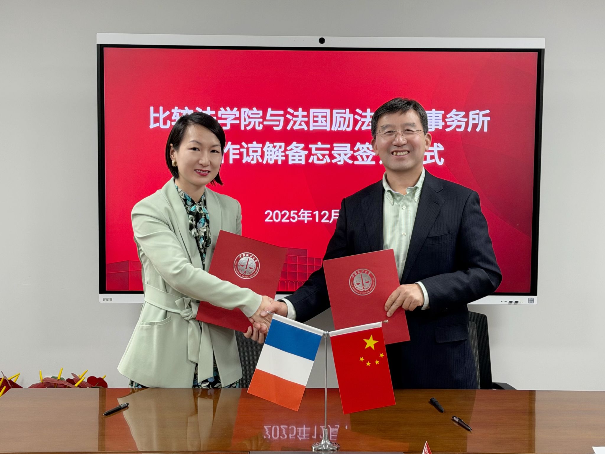 与会双方一致表示将在联合开设法国法相关课程、联合举办学术活动、提供学生赴法实习机会、设立优秀学生“励法奖学金”等方面展开进一步的合作并分别代表双方院所共同签订了合作谅解备忘录。