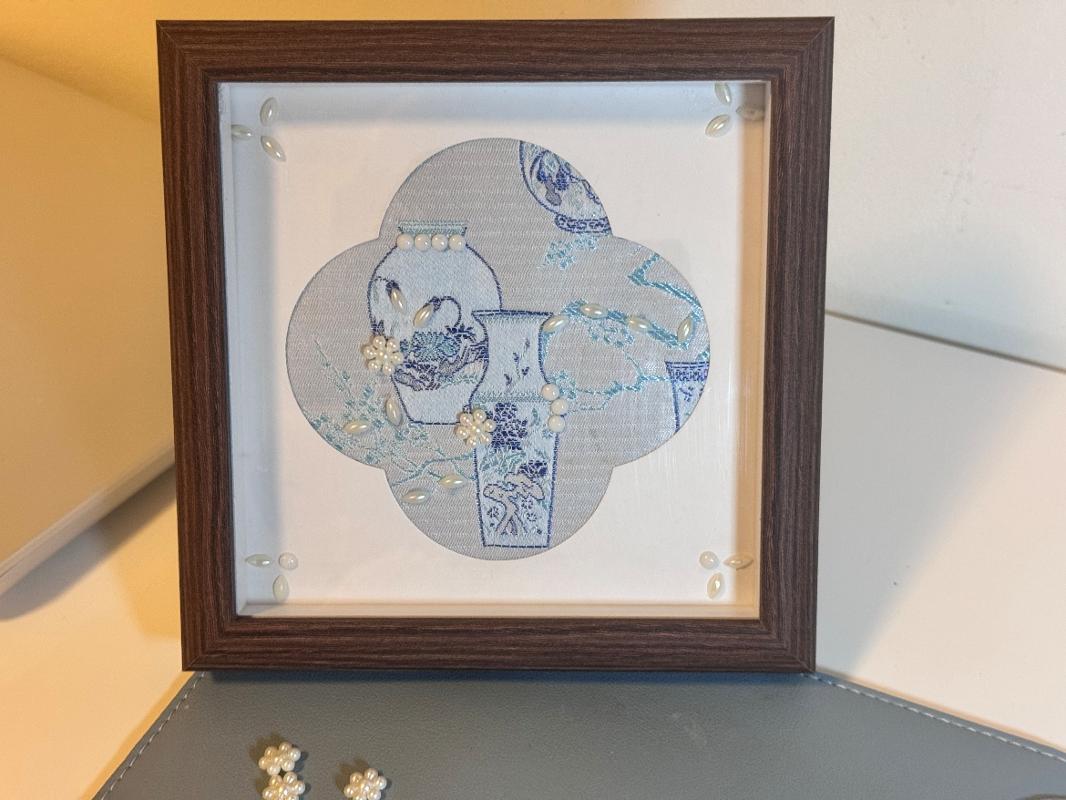 在活动开始前,同学们提前通过查阅资料、线上学习等方式,自行了解了宋锦——作为中国四大名锦之一,它不仅历史悠久,更以精致的织造工艺、独特的图案纹样彰显出独具一格的魅力。活动现场,指导老师分发了包含各色宋锦布片、珍珠配饰的制作材料包。在充满趣味的动手创作环节中,大家根据个人审美偏好裁剪宋锦底布,初步确定画作的轮廓与构图,再用珍珠进行自由点缀。有的同学选择独立沉浸于创作世界,精心构思,在静谧中完成与古典美学的对话;亦有同学三两结伴,互相品评配色方案,协作完成复杂图案,在交流探讨中激发灵感。同学们通过珍珠的疏密布局与色彩搭配,在宋锦上完成独具个性的艺术创作。在一裁一贴之间,传统非遗的韵味与个人创意巧妙融合,一幅幅各具特色的宋锦珍珠画作逐渐成形。