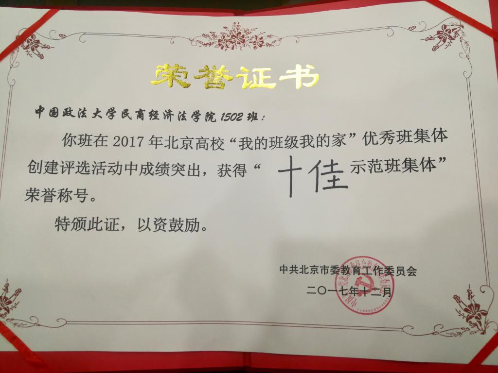 2017年12月20日,由北京市教育工委主办的2017年北京高校“我的班级我的家”十佳班集体创建答辩评选工作在北京工业大学举行,我校民商经济法学院1502班从众多参评班级中脱颖而出,荣获2017年北京高校“十佳示范班集体”荣誉称号。