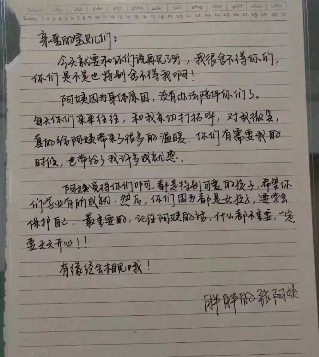2018年9月,日益严重的病痛迫使张素芳不得不选择离开。害怕突然的离开会让孩子们担心,于是,她留下了《“胖胖的张阿姨”给“亲爱的宝贝儿们”的信》,让孩子们安心的同时,也叮嘱她们注意身体,快快乐乐好好学习。