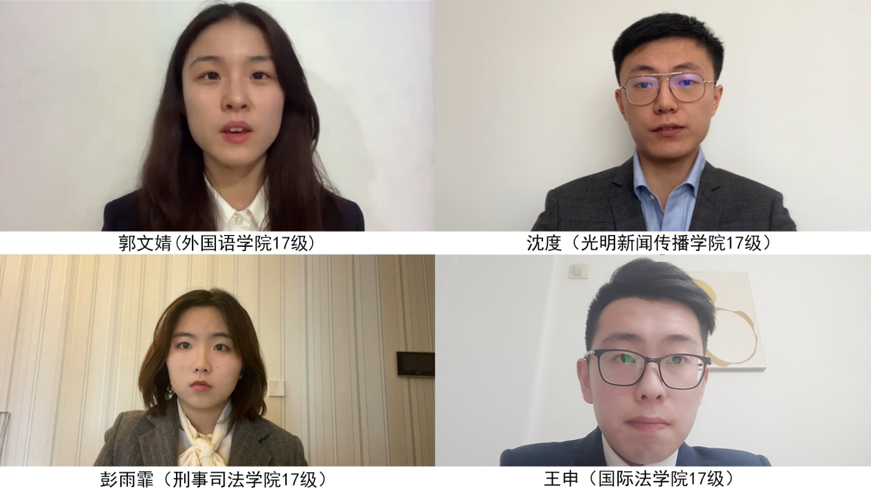 我校光明新闻传播学院自去年9月初开始备赛,由光明新闻传播学院王瑞奇老师担任指导教师。经过几轮选拔,最终确定队长沈度(光明新闻传播学院17级本科生),队员郭文婧(外国语学院17级本科生)、傅乐阳(政治与公共管理学院17级本科生)、王申(国际法学院17级本科生)、彭雨霏(刑事司法学院17级本科生)、闫锦麟(法学院4+1 15级本科生)六名选手参赛。