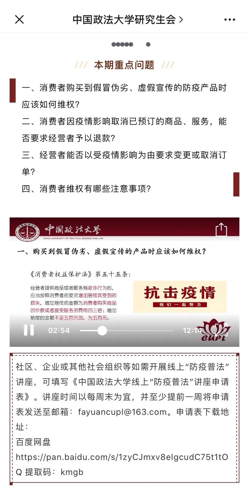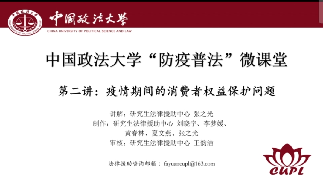 关于主题选择,志愿者们也尽可能地贴近疫情期间的热点话题,力求使普法宣传的“实用性”最大化。第二期普法微课堂栏目中,研究生法律援助中心重点关注了消费者权益的保护,主讲人张之光谈道,“消费者权益比较贴近大家的生活,比如疫情期间的物价、假冒伪劣产品、订单取消等问题,都值得我们的关注”。
