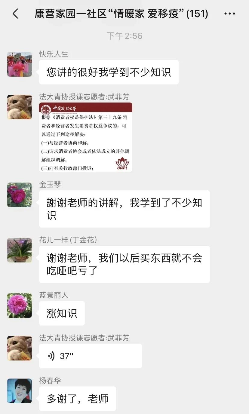 正值“3·15”期间,除了录制普法视频外,研究生法律援助中心还与青年志愿者协会法律援助部共同开展了一次别开生面的线上社区普法活动。3月15日,志愿者们分别在朝阳区志愿者群和康营家园一社区群,以语音交流、文字沟通为主要形式,辅以视频讲授、图片解说,为社区群众们带来一堂内容丰富的普法课程,从日常生活切入,讲述《消费者权益保护法》的相关知识。课程结束后,社区居民通过微信向志愿者们传递着感激,“谢谢老师的讲解,学到了不少知识,以后买东西就不用吃哑巴亏了。”