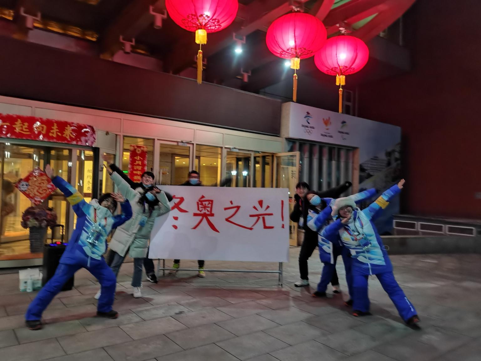 (特约通讯员 董奕航 杨豫)大年初四的夜晚,寒风渗透了夜幕,法大志愿者之家门口却闪烁着温暖的色彩,在欢快的音乐声中,孙韶刚、陈泽溥、宋尚奇和庄泽轩四人穿着一样的黑色羽绒服,举着“辛苦啦!”的红底字幅,向返回的志愿者们挥手致意。“快换好口罩回家吃饭!”“二层食堂给大家准备了夜宵!”“辛苦啦辛苦啦!”……从冬奥会开幕式结束志愿者回归的迎接字幅,到冬奥会闭幕式的剪纸大字、冬残奥会开幕式的荧光棒“五环”,再到志愿者回到驻地的每一个晚上,驻地保障团队七人总是以最热情、最有趣的方式迎接着回家的法大志愿者们,让志愿者之家总是洋溢着暖意温情。