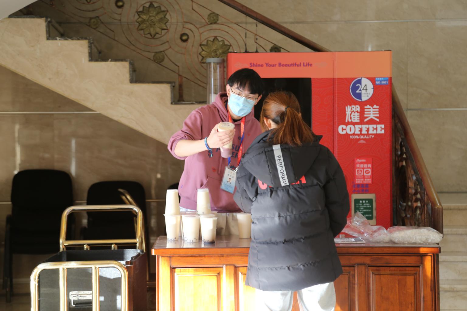 除了一天三次的防疫信息收集,“端升er”还有许多日常采购任务。为了改善志愿者驻地饮食体验,学校联系了食堂“奶茶大叔”饮品店定期给驻地送来饮品,宋尚奇便作为驻地负责人做起了收集大家订单信息、搬运和分发奶茶的工作。每到分发奶茶的下午,他总是用小推车将满满一保温箱奶茶拉进一层大厅,分类摆好,开始笑咪咪地等着大家来领走奶茶。久而久之,志愿者们都开始亲切地称呼他为“奶茶小叔”,这让宋尚奇也感到十分有趣和有成就感。“一开始很意外吧,后来就习惯了这个昵称,这也是同学们对我们工作的认可嘛!”
