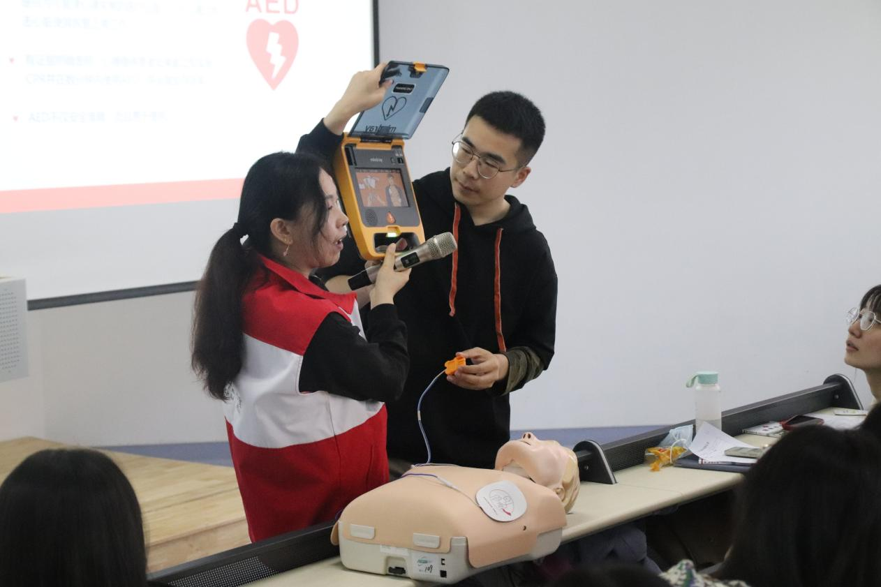 AED的使用方法也至关重要。在法大的校园内,AED已经实现了全面覆盖,例如健身房、教学楼、图书馆等地都可以第一时间取到。虽然使用方法简便,但是急救意识的缺位容易导致我们忽视它的存在。通过本次课程,我科学地认识到其重要性,也学习到了使用方法。