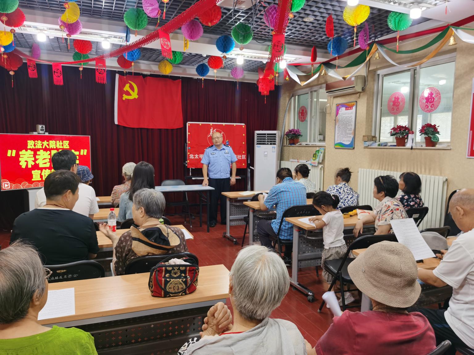 宣讲伊始,政法大院社区居委会的彭红副主任介绍了开展本次活动的目的与宣讲团成员。之后,北太平庄派出所的魏增巍警官结合反诈工作实际向参与活动的各位老年人强调了防范养老诈骗的重要性,社区的工作人员带领老年人学习了社区安全公约。