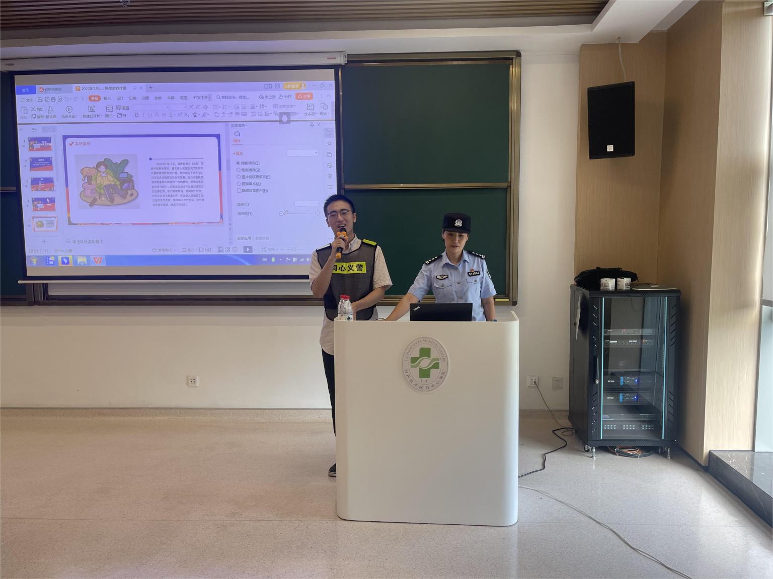 7月17日下午,宣讲团成员、刑事司法学院2022级刑法学硕士研究生王开同学参与了家乡当地派出所组织开展的防范电信网络诈骗宣传活动,在浙江省台州市路桥区路桥恩泽医院,面向大四年级的医学生进行了题为“警惕网络游戏诈骗”的反诈宣讲。