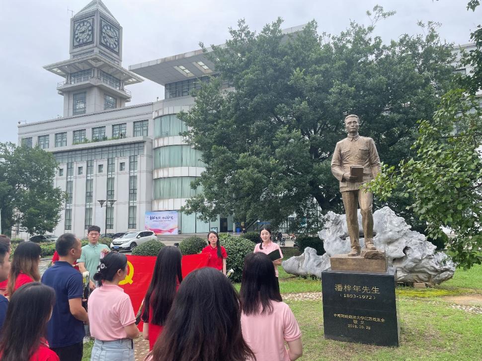 7月15日,夏令营师生走访中南财经政法大学,中南财经政法大学新闻与文化传播学院院长吴晓静教授在文波楼会议室为夏令营营员讲解潘梓年的办报实践与中国共产党早期新闻事业。随后,夏令营师生在潘梓年先生雕像下举行献花仪式并重温入党誓词。