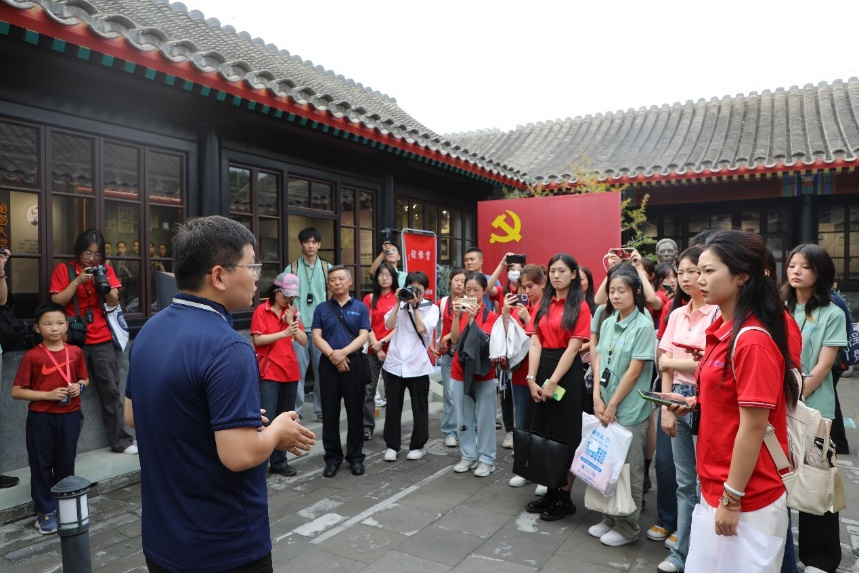 师生团队来到京报馆旧址(邵飘萍故居)实地了解《京报》的发展历史,光明新闻传播学院网络与新媒体研究所党支部书记屈高翔老师为大家讲解了“邵飘萍新闻思想及其当代价值”,透过“一报一馆一人”的故事引导大家走近邵飘萍的办报历程和新闻救国史,感受“飘萍一支笔,抵过十万军”的新闻力量,感悟革命先辈坚守立场、追求真理、不怕牺牲的革命精神。