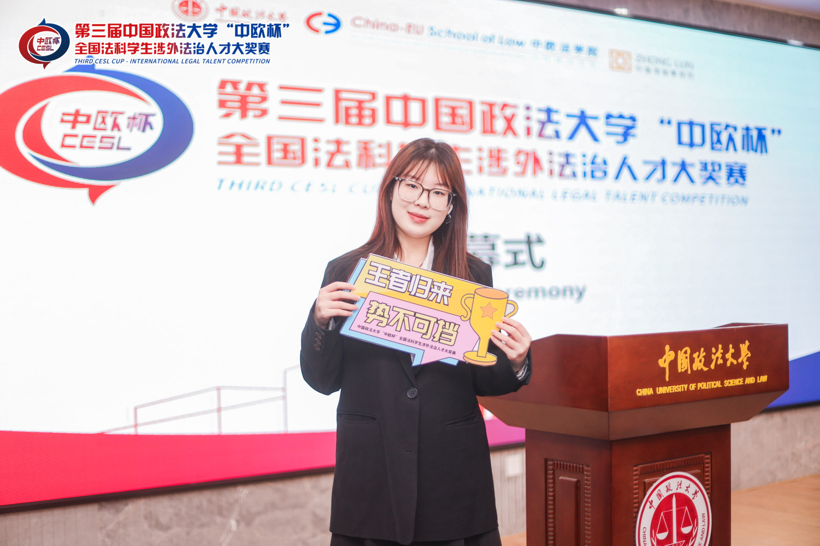 在我参加的大大小小比赛中,“中欧杯”是备赛时间最短、挑战最大的一次。如果让我去总结这场比赛的关键词,我会选择:高压、成长与友谊。“高压”来自两天四轮比赛,堪称对选手法律基础与抗压能力的双重考验;“成长”源于评委老师们给出的宝贵意见,对于每位选手的未来发展都大有裨益;“友谊”则是指在比赛中结识来自全国各地的优秀涉外法治人才,和大家切磋、交流,这对我来说更是珍贵的收获。