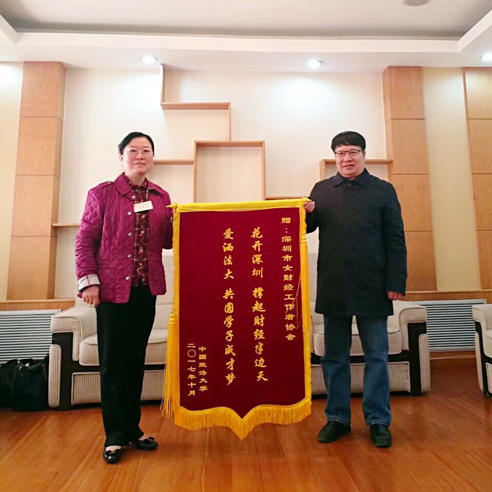 (常保国代表学校向深圳市女财经工作者协会会长朱彦赠送锦旗)