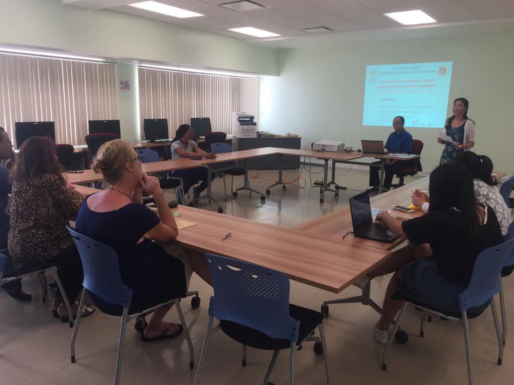 论坛由孔子学院汉语教师李仁燕博士主持。小型茶艺会后,以《中国和加勒比海妇女地位比较》为主题的文化交流开始。李仁燕首先将《诗经·关雎》介绍给大家,说明较远的古代妇女地位还是比较高的。封建社会开始对妇女逐渐加强了禁锢,从传统礼教的三纲五常再到《唐律》中明文规定“七出”、“三不去”对妇女的禁锢越来越加强。新中国成立后中国妇女的地位发生了天翻地覆的变化,迄今为止,中国形成了对妇女保护的完整法律体系,已经实现男女平等、同工同酬。为了增加趣味,也为了符合今日的节日气氛,李仁燕博士在介绍中间还特意邀请志愿者教师张可进行了诗朗诵表演以及传统戏剧片段欣赏等。参加者怀着浓厚的兴趣踊跃提问并各自分享了所在国家的妇女地位情况。