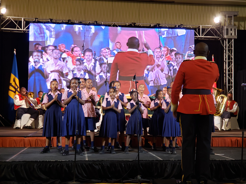 在巴巴多斯国防军乐团(Barbados Defense Force)的伴奏下,我校共建巴巴多斯孔子学院的学生精彩亮相,下设教学点的查尔斯·布鲁姆纪念小学学生演唱中文歌曲《歌声与微笑》,周日中文学校学生演唱具有当地SOCA音乐特色的歌曲《I am a Bajan》,寓意中巴友好,赢得到场嘉宾阵阵热烈掌声。周日中文学校学生手举巴巴多斯国旗,与现场观众形成良好互动,将招待会气氛推向高潮。现场观众欢呼雀跃,纷纷拿出手机拍照录像。