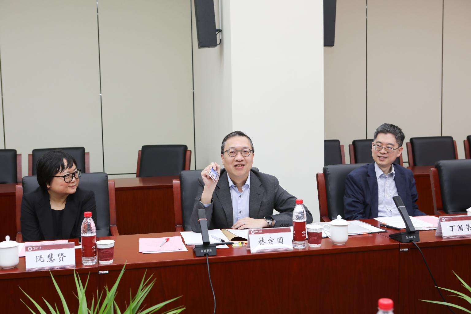 林定国对于重返法大倍感亲切。他手持法大校园卡回顾了自己在90 年代初次在法大课堂学习的情景,以及2019 年受聘为我校兼职教授为法大本科生开设《普通法一般原理》课程的难忘经历及美好回忆。他表示,党的二十大报告首次对“坚持全面依法 治国,推进法治中国建设”作出专章阐述,强调了统筹推进国内法治和涉外法治是中国式法治现代化的重要方面。香港因其独特的中英双语并用的普通法制度特色及“一国两制”实践经验,在参与国际交往、强化国际联系、处理国际仲裁等方面有其独特地位优势。年初国际调解院筹备办公室在香港的成立为把香港打造成为全球性法律服务争议解决中心提供了新的平台。香港特区政府律政司始终保持着与内地多所高校及法学院系的密切合作,与法大的合作更是不可或缺。他赞同与我校深化合作,并希望双方在密切双向交流的同时,加强涉外法治教学研究与对外传播等领域的合作及相关智库建设。