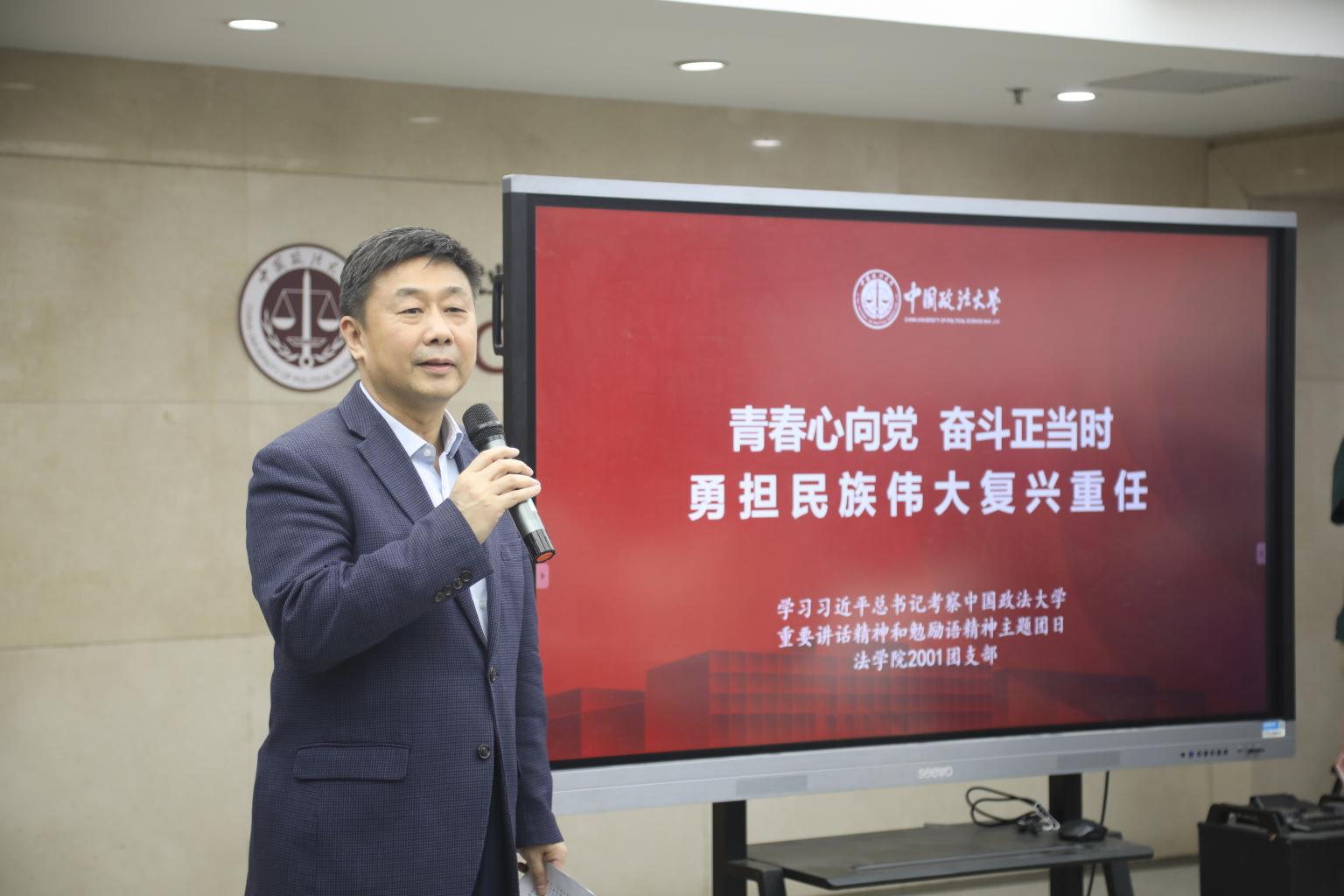 学生活动中心正在举办一场名为“青春心向党 奋斗正当时 勇担民族伟大复兴重任”的主题团日活动。五年前,习近平总书记正是在这里参加了民商经济法学院2015级2班团支部开展的“不忘初心跟党走”主题团日活动,如今,薪火相传,法大师生在此再度重温总书记讲话精神。活动伊始,大家观看了纪录片《百集微纪录·红色档案|县委书记的榜样》,回顾了焦裕禄同志在兰考的工作经历,学习感悟焦裕禄精神在新时代的重要意义。黄大年教师团队负责人、国际法学院教授霍政欣在观看影片后表示,将始终牢记习近平总书记考察法大的重要嘱托,把法学知识和家国信仰传递给一代代青年学子,使他们成长为德法兼修、明法笃行,维护国家主权和发展利益的新时代法治人才。马克思主义学院党委副书记吴韵曦从焦裕禄同志一生的四个重要选择入手,深入阐发了焦裕禄迎难而上的奋斗精神与扎根一线的求实作风,勉励青年学子不断践行习近平总书记考察法大重要讲话精神,立志为国家、为人民、为社会多做贡献。曾亲自参与五年前的主题团日活动、现任“1502”新时代青年知行社长张伊佳深情回忆了当年聆听习近平总书记教诲的诸多感悟,并回顾知行社近五年来的丰富实践经历,鼓励大家以实际行动实现习近平总书记对青年学生的殷切期待。