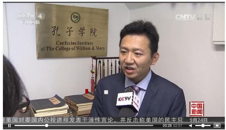 刘震老师在美国威廉玛丽学院主讲《周易》,接受中央电视台采访