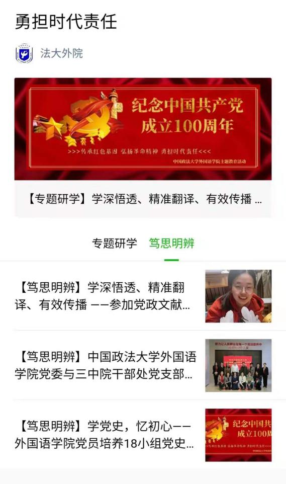 外国语学院党委高度重视学生党史学习教育,以师生调研、教学研讨等形式将“学史”与“力行”相结合,努力办实事、创新局,师生共庆建党100周年。截止2021年4月14日,外国语学院本科生中共党员31人,中共党员、中共预备党员、发展对象和入党积极分子共177人。为增强党史学习教育实效,强化学生党员党性、党纪教育,增进学生党支部的凝聚力和向心力,外国语学院学生工作办公室根据学生专业和党员培养教育阶段,将177名同学划分为19个党员培养小组,每个小组由党员、预备党员担任组长、副组长,负责小组学生的党史学习教育和党员培养的活动组织和参与记录,实现党史理论学习和实践历练全覆盖,努力培养在党爱党,在党言党,在党为党,能够担当实现国家富强、民族振兴和人民幸福时代重任的优秀青年中国共产党党员。截止2021年4月20日,9个小组42名学生先后参加了“红歌嘹亮-经典红色歌曲传唱”“线上经典诵读”“红色记忆”“专题研学”和“笃思明辨”等活动。