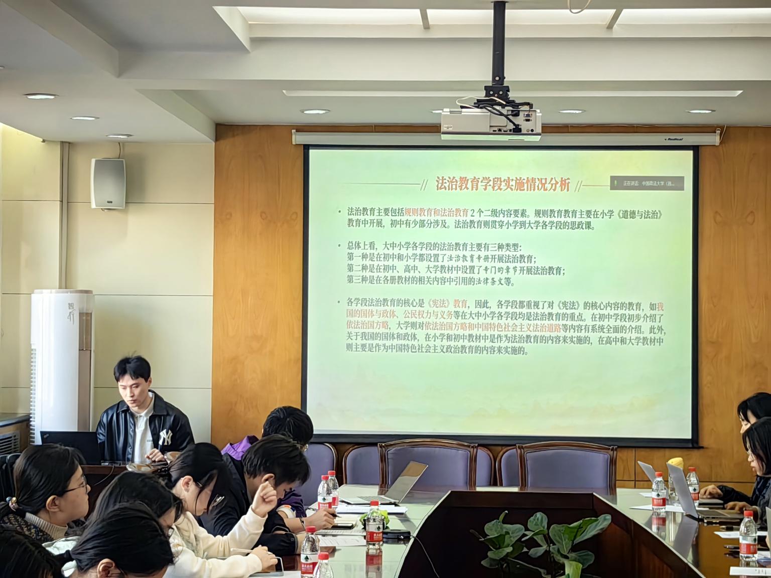 会议伊始,根据寒假活动统计情况,共有四个优秀小组进行了主题展示,他们研究的主题分别是“习近平法治思想融入大中小学一体化法治教育路径探究---以昌平区大中小学思政教育为例”“‘一带一路’视域下对‘统筹国内法治和涉外法治’的学习——从加勒比海地区展开”“加快推进基层普法,筑牢中国式现代化法治根基——以2026美加墨世界杯比赛时间普法活动为例”“法驻桑榆,‘枫’景正好:新时代枫桥经验的北京实践——以涉老纠纷多元化解决为切入点”。四个小组代表从选题介绍、前期学习实践、成果分享和后期展望四个方面分享了自己的学习经验和感悟。在活动开展过程中,各小组查阅大量论文与相关著作,深刻学习并理解理论知识,深入实地细致调研,紧紧围绕习近平法治思想展开各项活动,探讨如何更好地推进法治建设,积极提出自己的想法并勇于付诸实践。其他小组也表示在他们的分享中看到了自己努力的影子,并收获了许多感悟与经验。