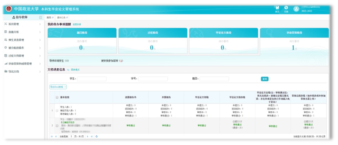 管理系统对选题、开题、初稿、修改稿、定稿提交时间设置相应节点,学生在完成相应节点任务后,指导教师随即进行相应指导和检查,并给出详细意见。学生按时提交毕业论文的同时,能够获得老师及时指导,大大提高了毕业论文工作的效率,有效避免了“拖延症”现象的出现。