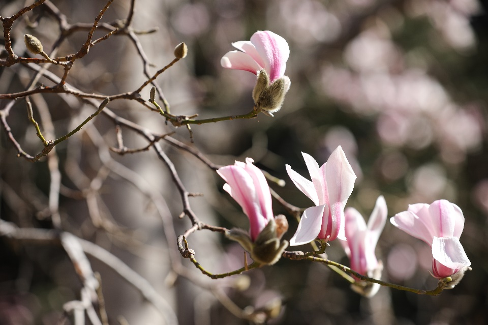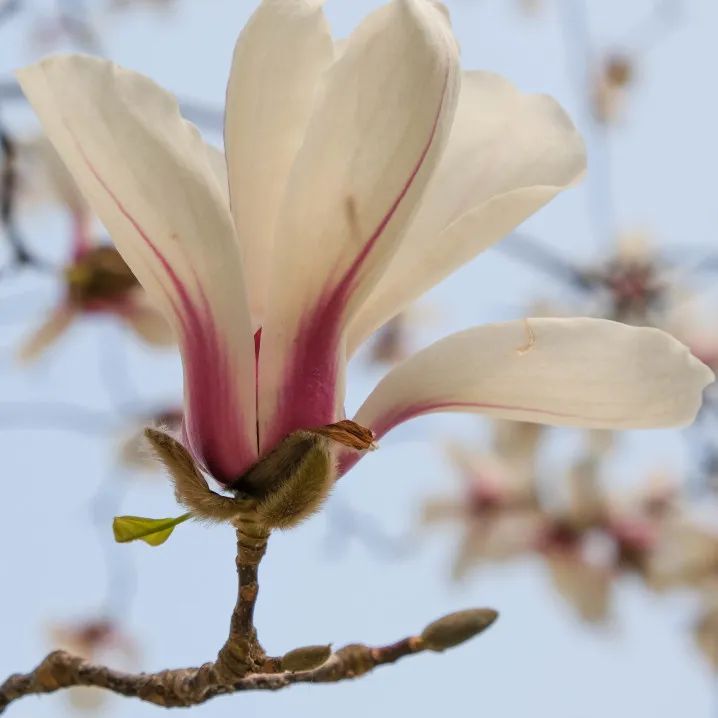 辛夷远观还似毛笔笔头,故另有别名曰木笔花。唐代诗人卢肇就写过《木笔花》:“软如新竹管初齐,粉腻红轻样可携。”生动形象地描摹出辛夷花苞似笔的特点。如今,古人提及的木兰花、辛夷花、木笔花均被当代人视为广义上的玉兰花。