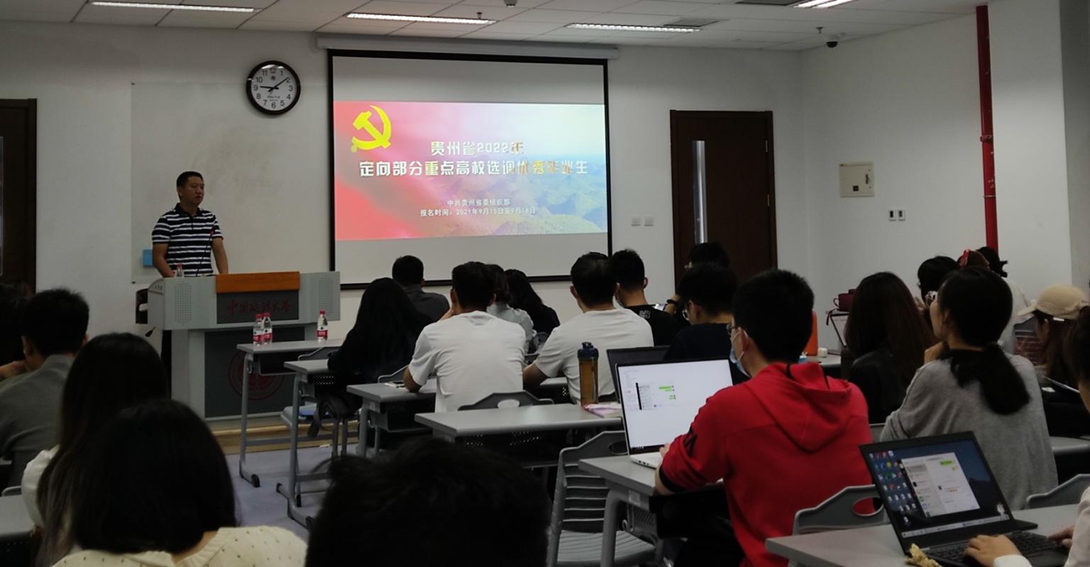 9月15日,贵州2022年定向我校招录选调生宣讲会在海淀校区举行。贵州省遵义市公务员服务中心主任刘先逊、组织部公务员管理科科长黄磊、我校学生就业创业指导服务中心主...