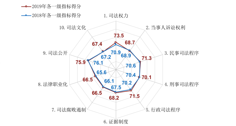 1.司法文明指数10个一级指标的最大分差为9.4分,比2018年最大分差10.5分缩小了1.1分。从10个一级指标的平均得分来看,“司法公开”依然得分最高(75.9分),“司法腐败遏制”得分最低(66.501分),反映了人民群众对其满意度较低;一级指标8“法律职业化”得分倒数第二(66.530分),反映了司法改革的成效还不够明显。具体得分,详见下图。