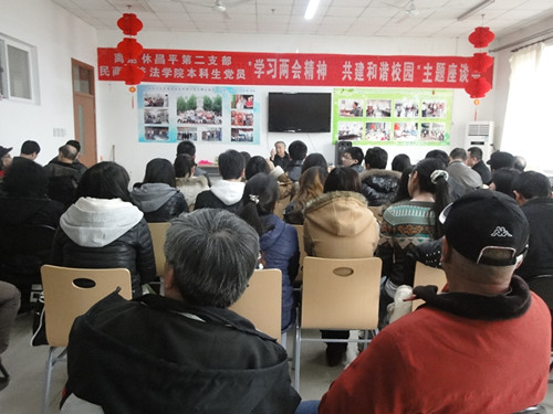 3月15日下午,我校离退休昌平第二党支部和民商经济法学院分党委共同举办的“学习两会精神 共建和谐校园”党员座谈会在我校昌平校区离退休干部活动室顺利举行。