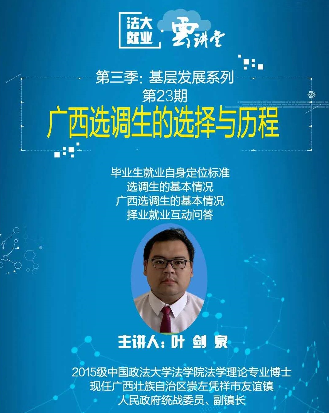 5月23日19:00-20:30,就业云课堂第二十三期“广西选调生的选择与历程”就业指导线上讲座成功举办,我校优秀校友、广西壮族自治区崇左凭祥市友谊镇人民政府统战委员、...